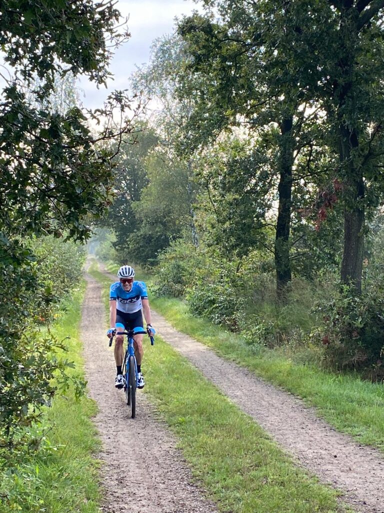 Tot de eerste verzorgingspost reden wij (gelukkig) in een gestaag tempo door het Brabantse land achter onze locomotief Richard, bijgestaan door Marc. De organisatie had het goed voor elkaar bij deze posten. Er was flink wat drinken en eten voorradig. Na deze post begon de tocht meer op een wedstrijd te lijken, althans voor ons. Bram Tankink kwam met een groep renners, die zich aan het voorbereiden zijn op de WK Gravel in Leuven, ons voorbij rijden. Wij oude mannen, dat mag ik toch wel zeggen (op een ander bijvoeglijk naamwoord werd overigens minder enthousiast gereageerd), waren zo gek om hierbij aan te sluiten. Rik was nog zo gek om even met Bram (Rik: "Jij kent het parcours goed") op kop te rijden. Had hij dat maar niet gedaan. Tien minuten later reden wij met een snelheid van tussen 35 en 40 kilometer per uur over de Brabantse grindpaden achter Bram en de Belgische gravel-kampioen aan. Na een minuut of 20 begon "gelukkig" ons lichaam het te winnen van onze geest. Wij lieten deze groep gaan.